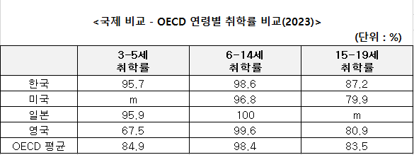 - 취학적령인구는 유치원(만3~5세), 초등학교(만6∼11세), 중학교(만12∼14세), 고등학교(만15∼17세), 고등교육기관(만18∼21세)를 의미